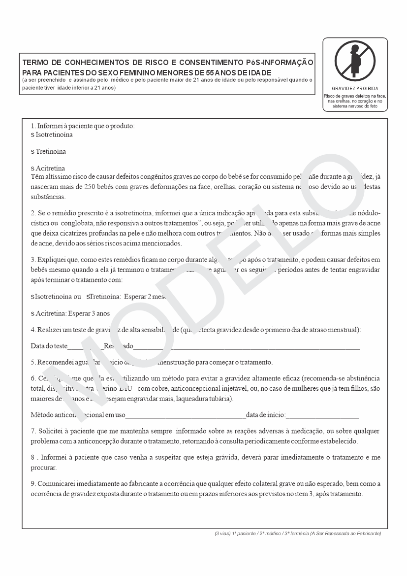 O Termo de Conhecimento de risco e consentimento é um documento que deve acompanhar a prescrição de medicamentos retinoides de uso sistêmico, como o Roacutan (isotretinoína). Ele serve para informar o paciente sobre os riscos, benefícios e efeitos colaterais do tratamento, e para obter o consentimento do paciente para iniciar o tratamento. É destinado a profissionais da saúde que prescrevem esses medicamentos, conforme regulamentado pela Agência Nacional de Vigilância Sanitária. Produzido com alta qualidade, este bloco é uma solução segura e prática para a prescrição de substâncias controladas.